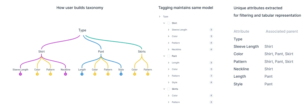 We used a hierarchical tree to handle large taxonomy structures when bulk editing. This was done so that the mental model of taxonomies remained the same across different modules. We iteratively brought in interactions to make the bulk editing more efficient.