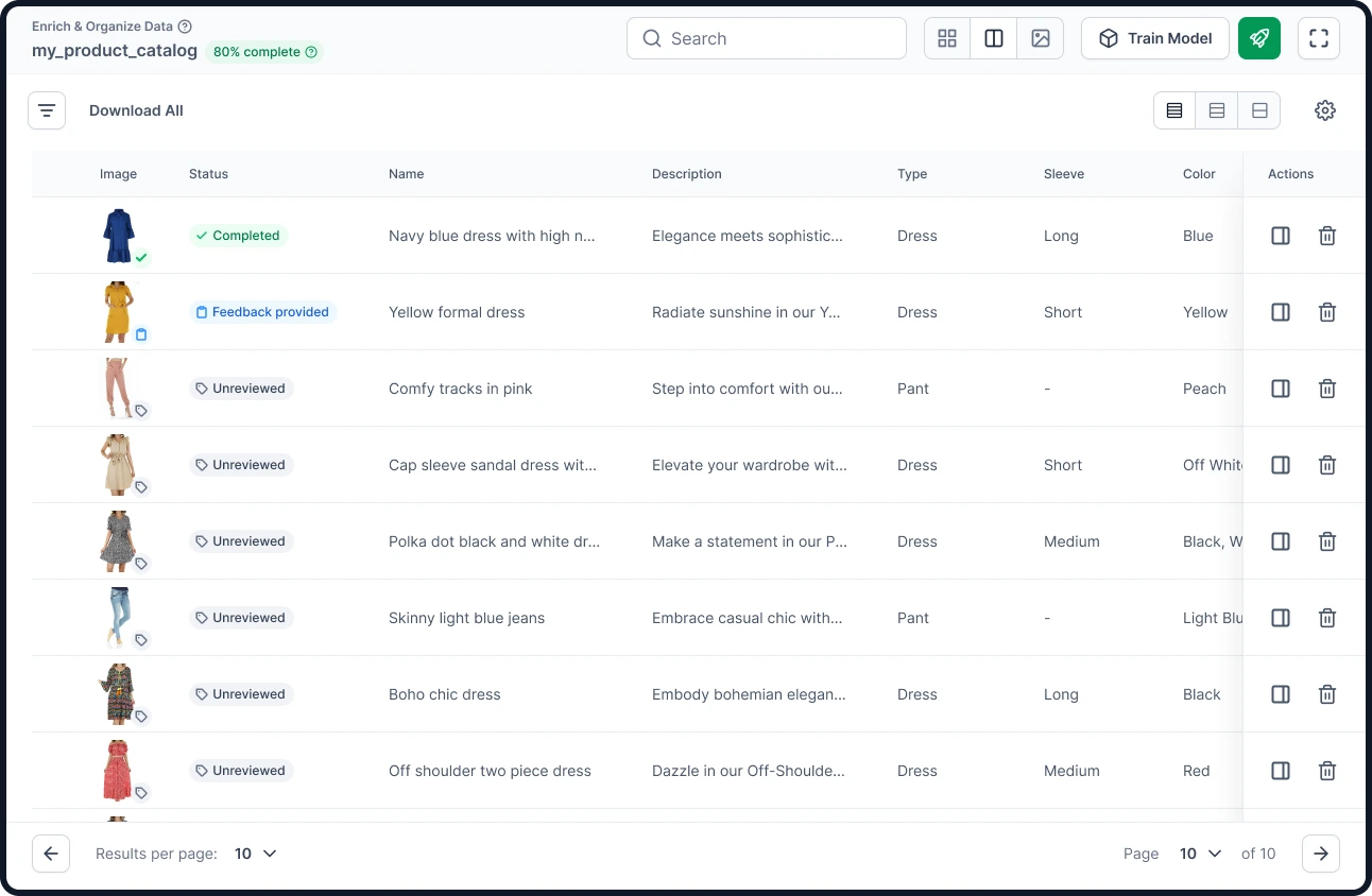 The product focuses on enhancing and organizing data. Users can use a preset or build their own custom classification model to predict data from image or text. Users build a taxonomy, tag some products, and train the system. The model then auto tags the rest of the products. QA analysts play a key role by fixing any wrong predictions, improving the model. The trained models and custom taxonomy can be easily exported to fit into existing systems.
