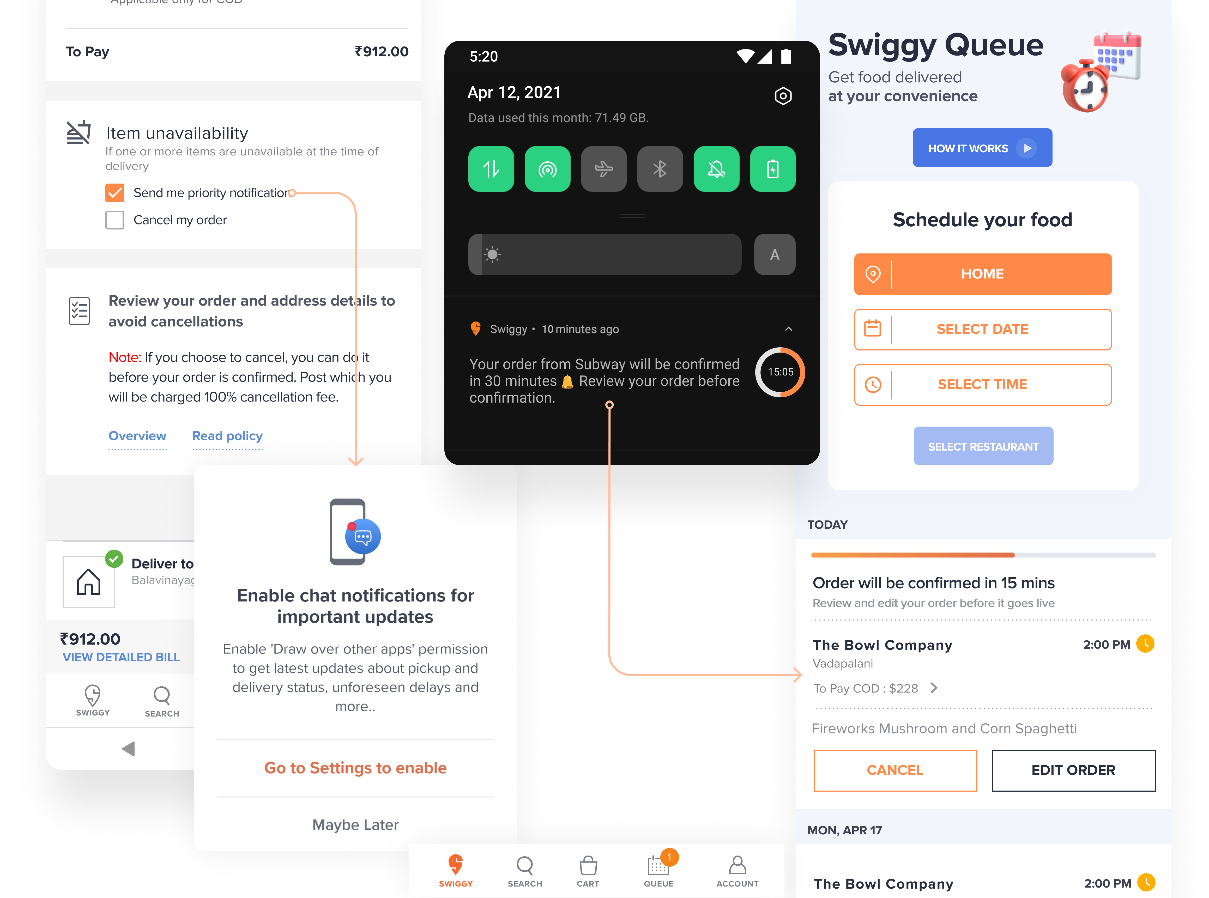 Finally, on confirmation of order users are notified that they can manage their orders in the Swiggy Queue section.