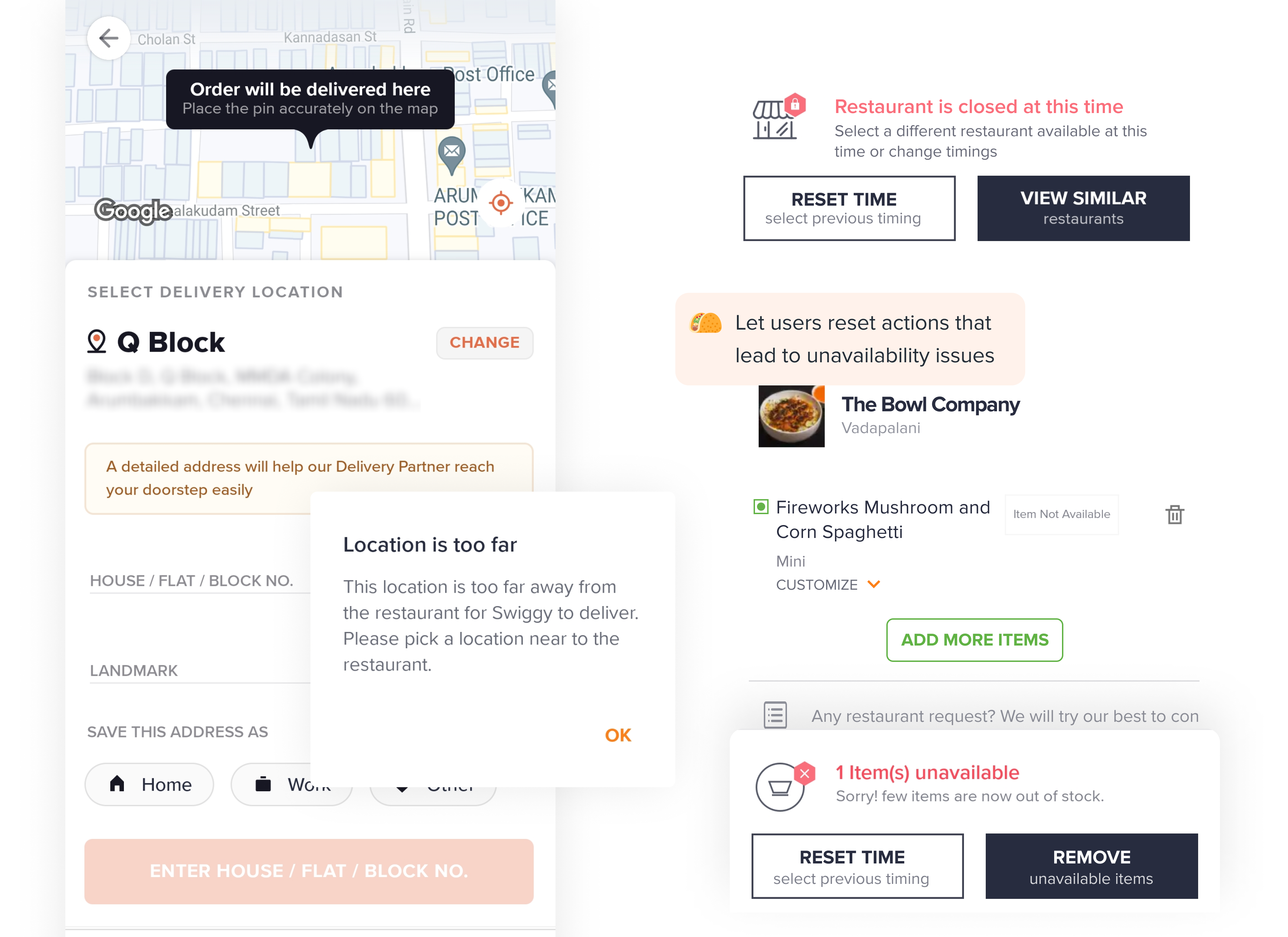 As I said before, if users choose to change the location, date, and time of delivery of scheduled orders in the cart page, it might lead to some unavailability issues, either the dish not being available at the given time, and/or restaurant not delivering at the selected time or location.